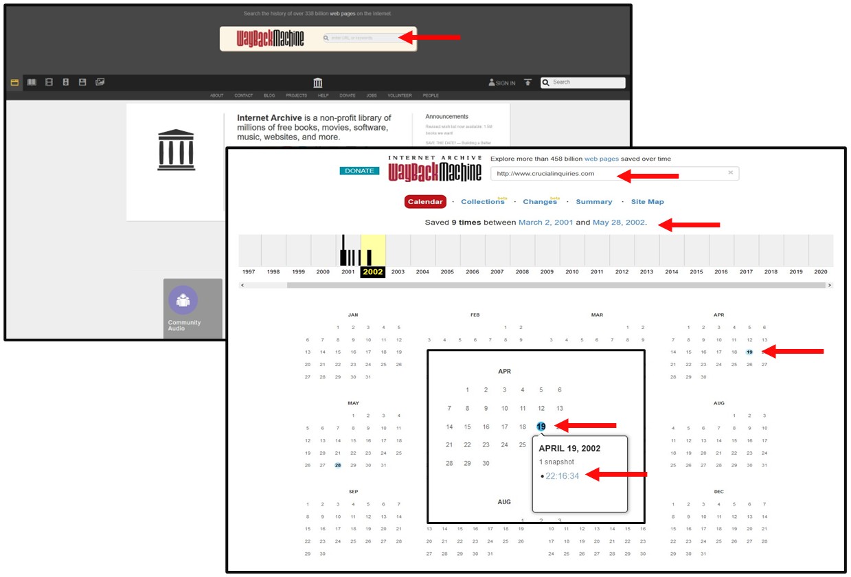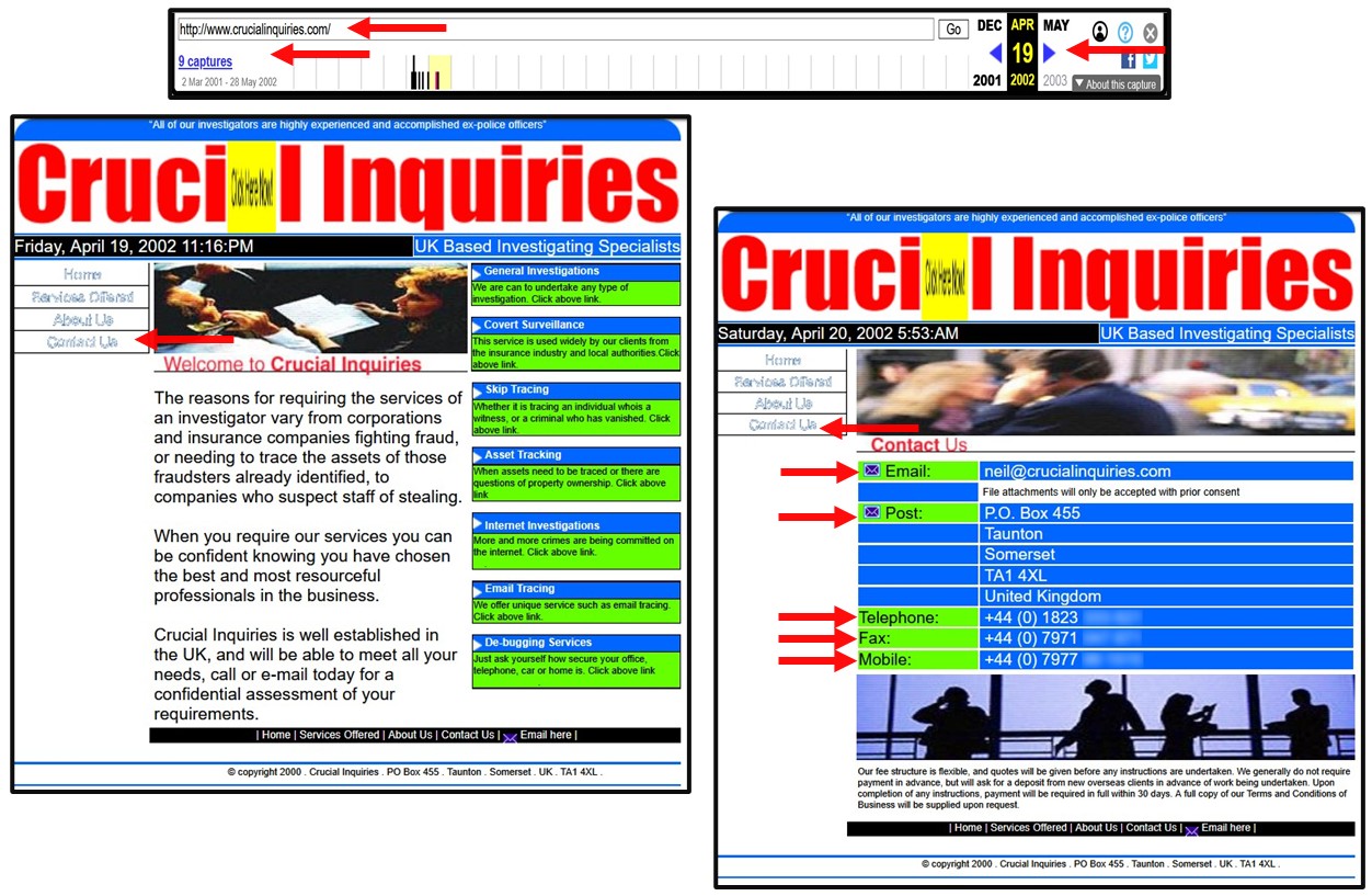 Obviously you could undertake WhoIs / WhoWas type enquiries, using some of the sites under the Reverse (Pre-GDPR) Whois Details Linked To Domain Names, Registrants And An E-Mail Addresses heading on the Domain Names & IP Addresses page of this website, but importantly, you can also search the Domain Name on an archive site to see what was previously shown on the website. Put the Domain Name as a URL in the search box, including the http:// or https:// and it will return details of any archived copies of the website it has, showing how many copies it has, between what dates, going back as far as 1996.