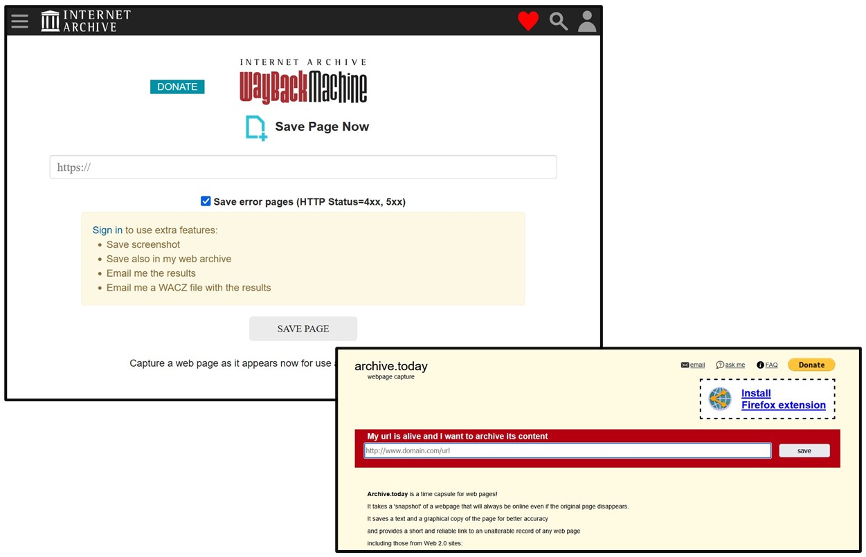 When researching or visiting a website or page, it may be useful to ensure that there is a copy of it saved from that date, which is accessible on an Archive site, such as at Archive.Org or Archive.Today. To do this, both sites have areas where you can post a URL, to have it saved and archived at that time, with those pages being available Here for Archive.Org and Here for Archive.Today.