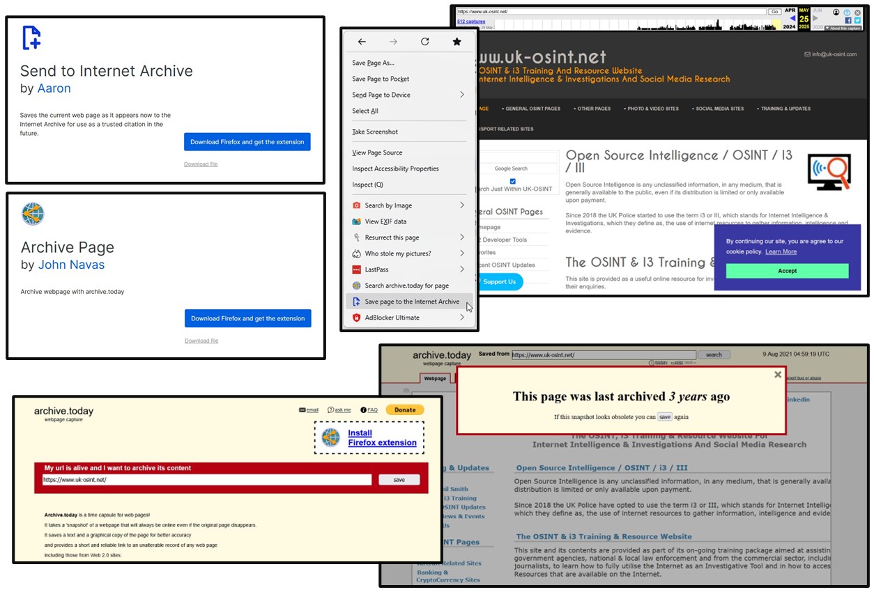 As always there are some useful Add-ons & Extensions, which can make this an easier process, by adding icons to your tool bar (and available via a Right Click), which can be selected when on a website or page of interest, which causes it to be sent straight to the archive site for archiving. With Add-Ons / Extensions for Archive.Org available on FireFox & Google Chrome, and for Archive.Today available on FireFox & Google Chrome.