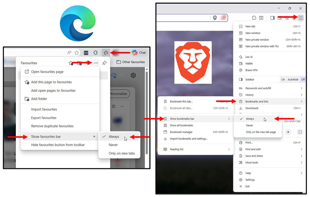Click in the Favourites Star Icon on the top righthand side of your browser, then select the three dots, and then select Show Favourites Bar, and then select Always.