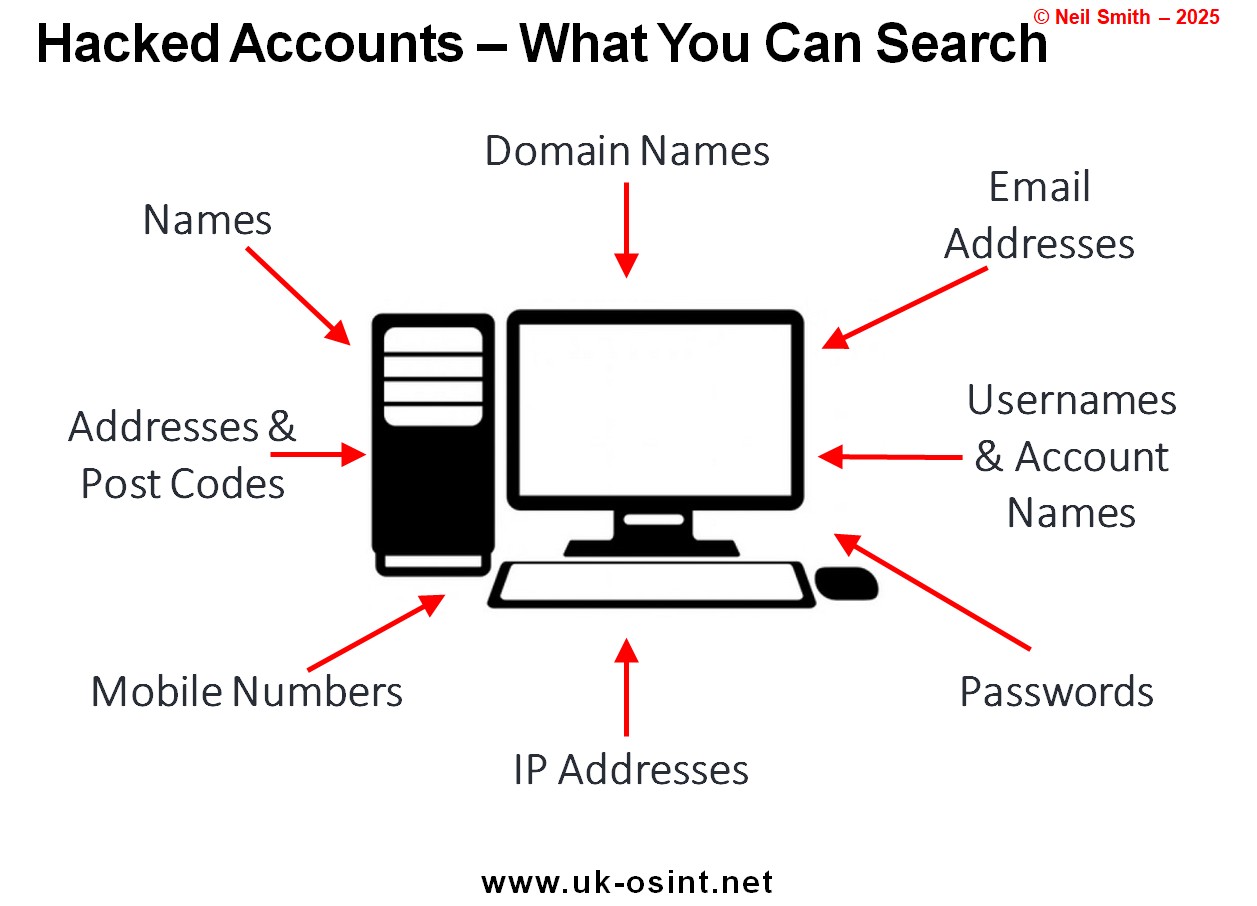 There are a number of really useful online resources, both Free and Paid For, where you can research an individual or even a company, to see if an email address, mobile number, a username etc, have been linked to any hacked details.