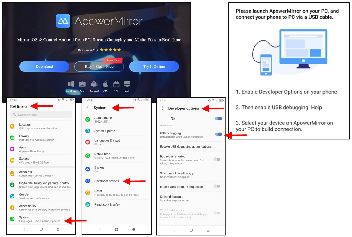 Whilst the more expensive iPhones tend to connect easily to your computer, APowerSoft may indicate that with the cheaper Android phones that you need to make changes to the Settings on your phone to enable the connection. This usually just involves turning on the Enable Developer Options and then to Enable USB Debugging. Just follow the online instructions, but if you are struggling you can just Google how to do this for which ever model of phone you are using.