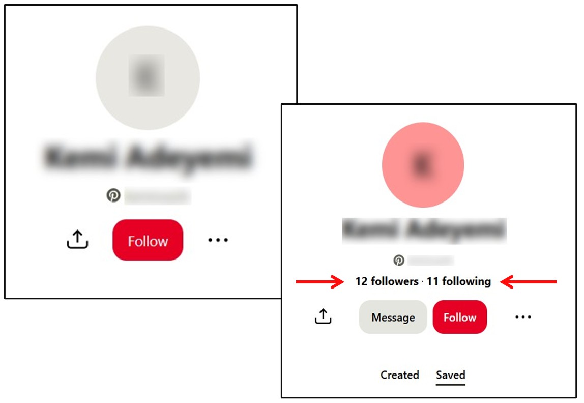 So if your subject has a Pinterest account but a fairly common name, so can not be easily identified on Facebook or Instagram etc, then check which accounts on Pinterest it is linked to. Amongst its Followers / Followings, look for accounts with similar family names, or regular individuals accounts, not celebrity or business or verified / blue tick accounts, and check them out on Facebook or Instagram etc, and if you locate an account for them, then check those accounts Friends / Followers etc, looking for the account of your subject.