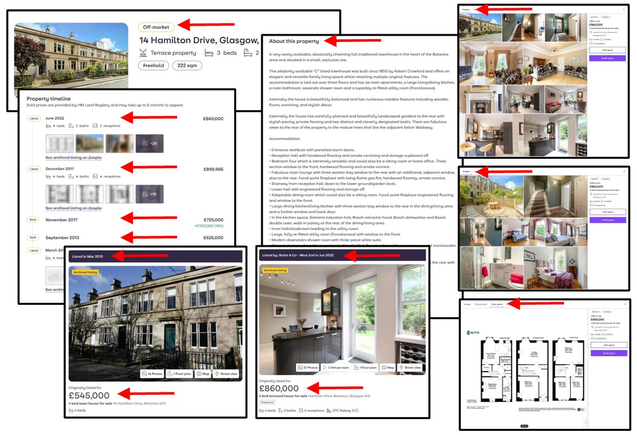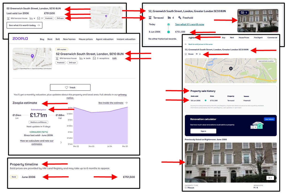 So, as an example, using the known address of the former Prime Minister Liz Truss, of 52 Greenwich South Street, Greenwich, London, SE10 8UN, you can search the post code on RightMove and Zoopla and see that this is a 4 Bed, Mid Terraced, Freehold Property, which was last sold in June 2006 for a reported price of £751,500 and that the estimated value of it is now between about £1.54 & £1.88million.