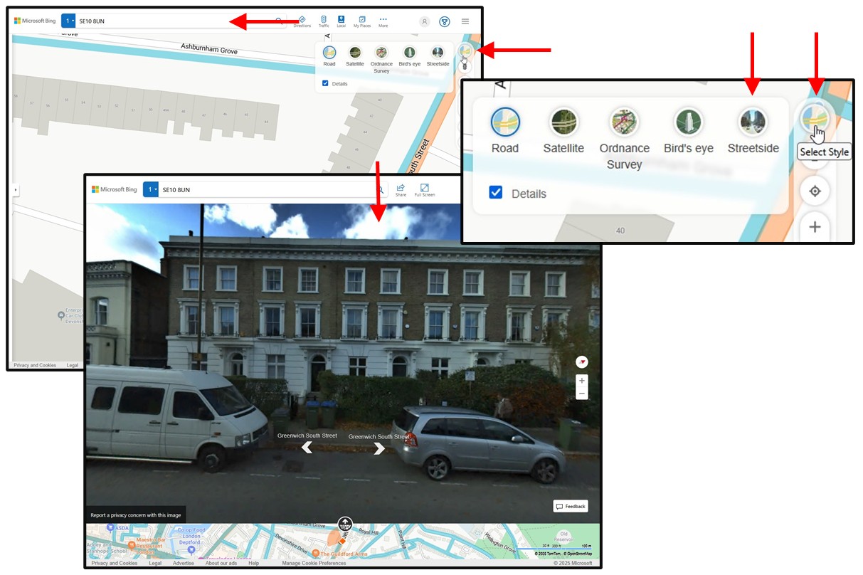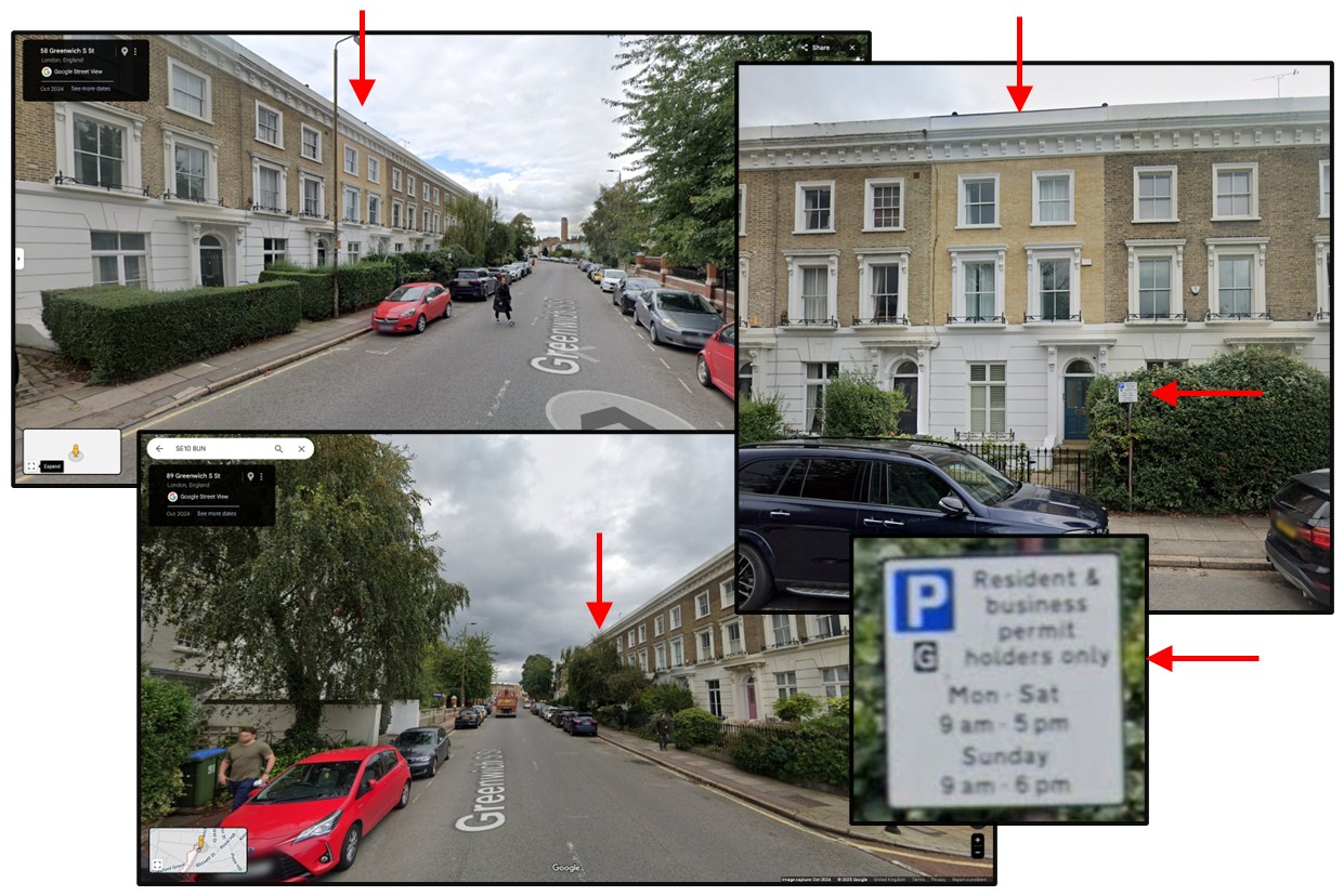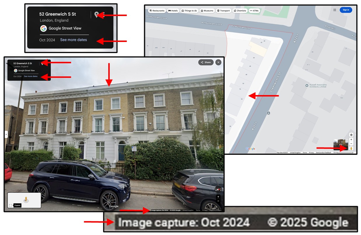 Using an online resource such as Google Streetview is ideal for obtaining an image of a property, to include in your report. So, as an example, using the known address of the former Prime Minister Liz Truss, of 52 Greenwich South Street, Greenwich, London, SE10 8UN, we can search the address or just the post code on Google Maps, to identify the property, before selecting Google Streetview, by dragging the yellow man in the bottom right to the desired location. In the top left display box, and in the bottom right details, it should show the month and year that the image dates from.