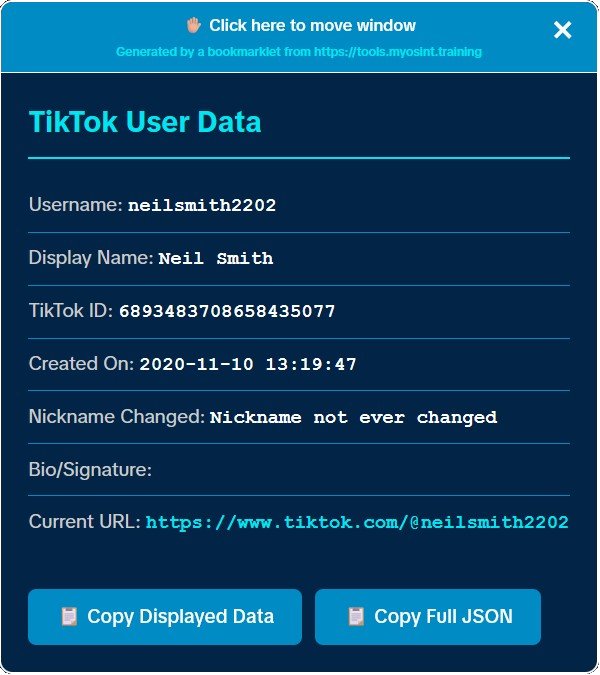 The TikTok Date Revealer Bookmarklet from MyOSINT.Training is another useful tool. Once installed it can be used when viewing a TikTok account profile page, and it will add the date and time to each video or reposted video on the page. This is really useful, if an account you are researching has posted a high number of videos, and you need to quickly go straight to a particular date.