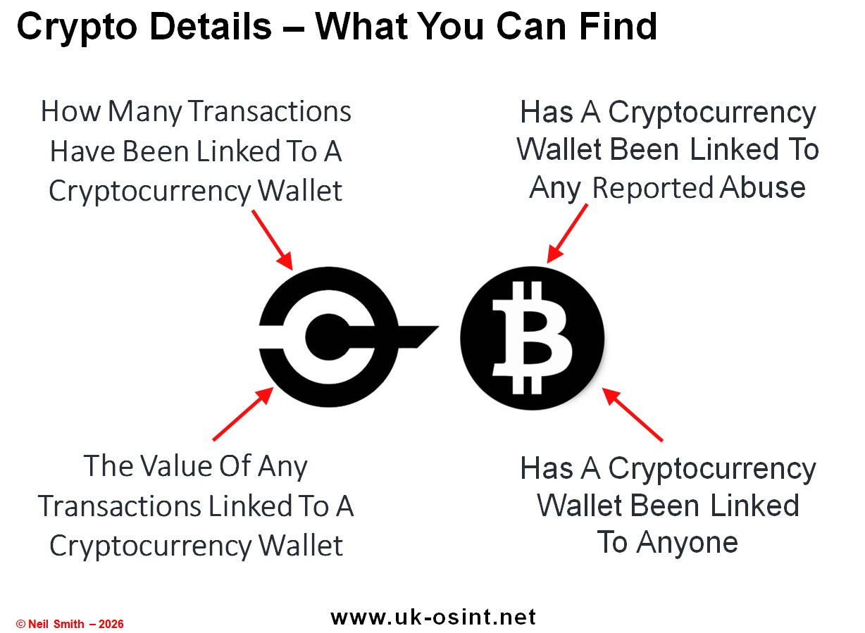 Interesting Articles On Understanding And Investigating Crypto's learnmeabitcoin.com - a basic guide to Bitcoin and cryptocurrencies cryptocurrencyfacts.com - Introduction to cryptocurrency secjuice.com - the basics of OSINT for cryptocurrency investigation (part 1) secjuice.com - OSINT for cryptocurrency investigation (part 2 - how I research a Bitcoin Wallet's past) acfcs.org - Bitcoin Tracking for Law Enforcement: A Guide To Crypto Investigations merklescience.com - how to become a certified crypto investigator merklescience.com - top mistakes investigators make when investigating crypto crime merklescience.com - understanding crypto currencies & crypto crime merklescience.com - investigative strategies for crypto crime merklescience.com - investigating dark web transactions - challenges & Solutions merklescience.com - how to trace illicit crypto funds across chains merklescience.com - cross chain analytics law enforcement gijn.org - Introduction to Investigative Journalism: Following the Money europa.eu - Europol Spotlight On Cryptocurrencies: Tracing the evolution of criminal finances researchgate.net - an analysis of bitcoin laundry services thenextweb.com - here's how criminals use Bitcoin to launder dirty money medium.com - collecting bitcoin wallet info for osint purposes