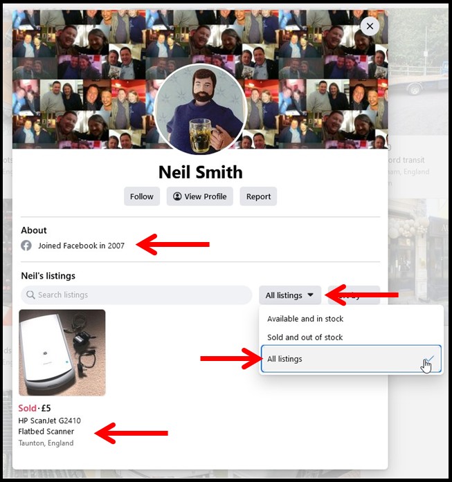 Use the drop down selector and change it from "Available And In Stock" to "All Listings", which will display all the items which have been offered for sale by this account on public Marketplace sites, which can then be checked for useful details, such as the location, dates offered and any useful contact details within the content of the posts.
