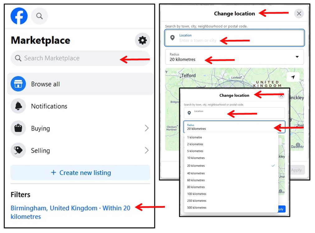 Step 2 - As in the above images, any items of interest can be searched for by their inclusion in the search box situated in the top left corner. You can then alter the location to be searched within Facebook Marketplace, selecting an area that matches the location from the posting of interest on eBay or Gumtree etc, looking for matching posts.
