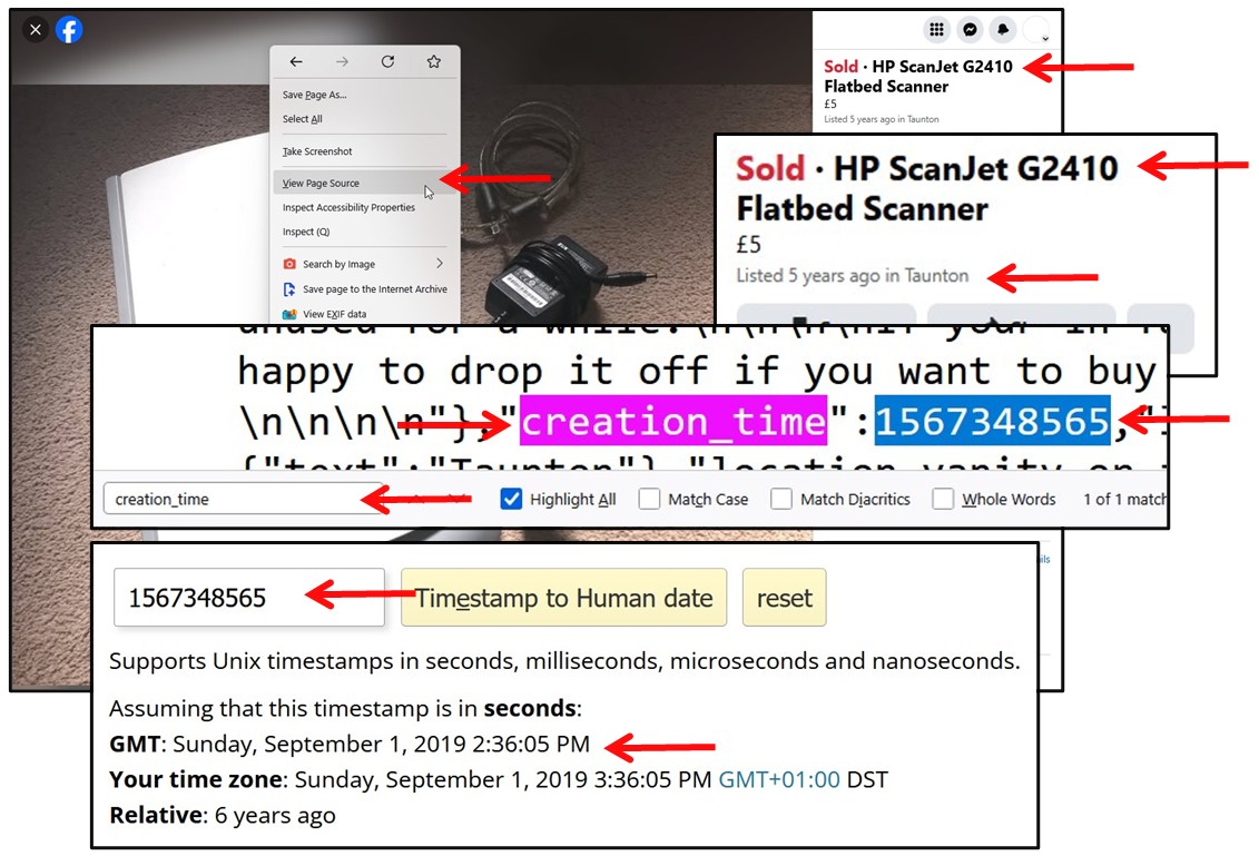 If the exact date of a Facebook Marketplace Listing is not shown, then it can be located by viewing the Source Code (right click & View Page Source) from the Marketplace Listing. Then search the Source Code (Ctr + F) for the term creation_time, after which there will be a 10 digit number or similar, which if you copy and then paste into a UNIX Converter, many of which are listed on the Time Zone & Time Converter Related Sites & Links page of our website, it will be converted into the date and time (in GMT) of when the original Marketplace Listing was uploaded.