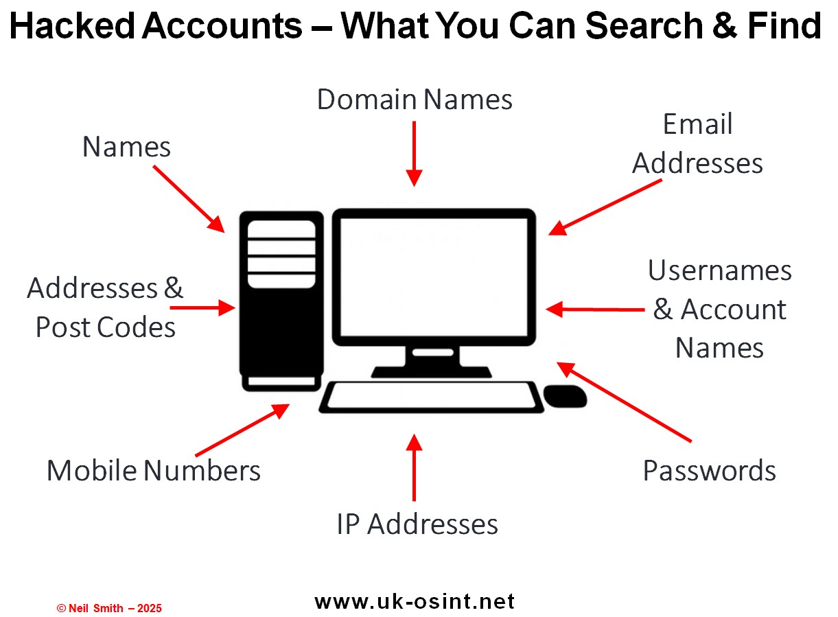 There are a number of really useful online resources, both Free and Paid For, where you can research an individual or even a company, to see if an email address, mobile number, a username etc, have been linked to any hacked details. These aren't usually individual accounts being hacked, but more often relate to large scale hacking events or cyber-attacks, where a company or online site has been hacked, and millions of account holders details illegally obtained and then sold on or leaked online.