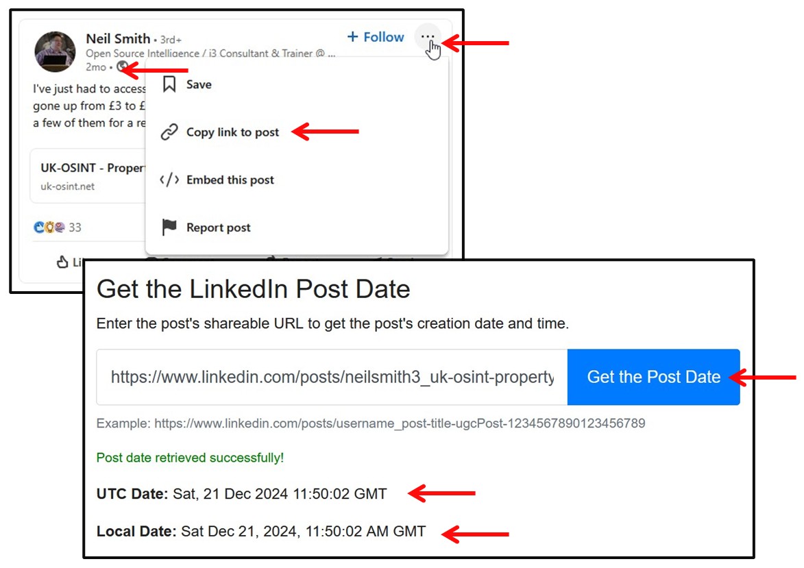 If you are viewing a Linkedin account for an individual, and checking their Posts, you can obtain the exact Date & Time of any Posts, by Clicking on the three dots in the grey circle at the top right of the Post, then select Copy Link To Post.