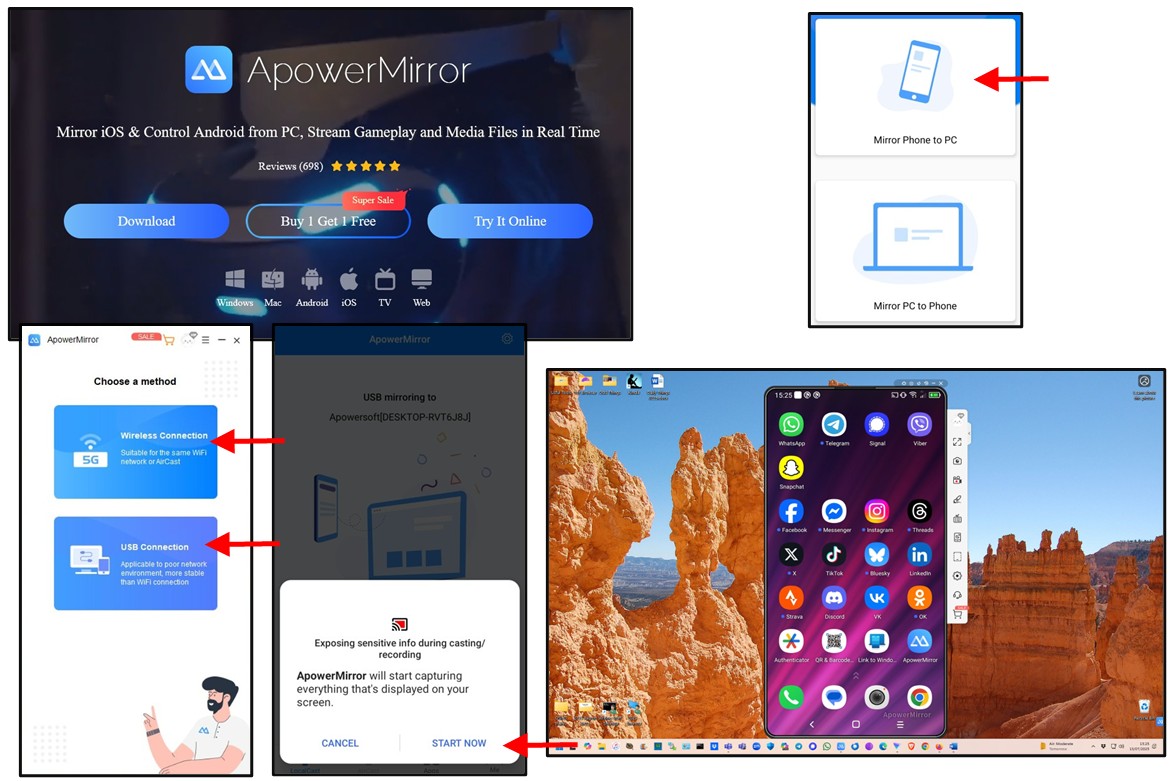 Then just connect your Burner / Smartphone via USB to your computer, and turn on your APowerSoft on your computer and follow the online instructions, and then your Burner / Smartphone will be Displayed / Mirrored on your Computer Desktop.