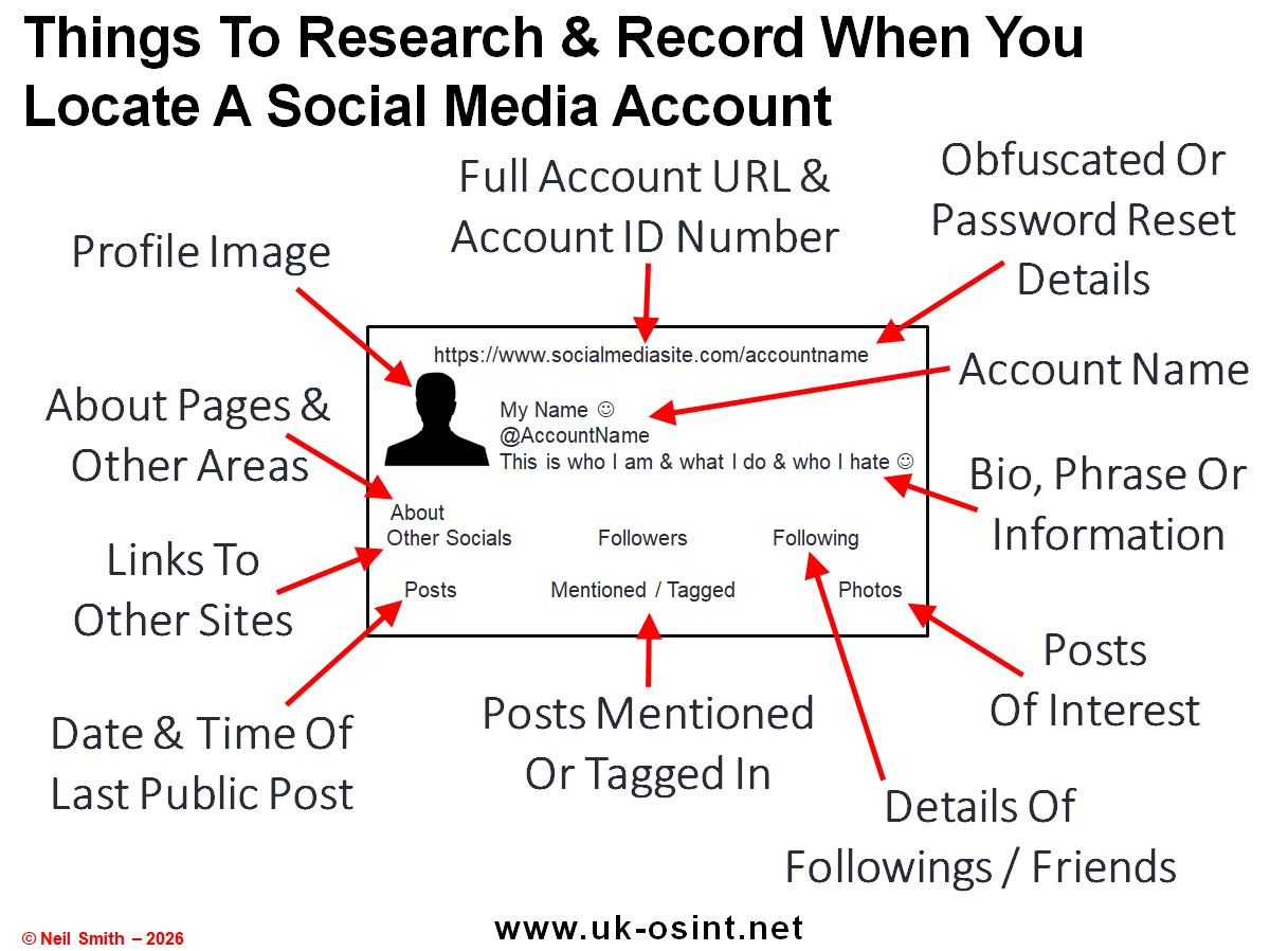 When you have located a social media account of interest there are a number of things which you can research and which you should record, to help you progress your investigation.