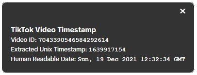 Install the TikTok URL Date Decoder Bookmarklet from MyOSINT.Training, which can be done by adding it to your Browsers Bookmark Toolbar. Either Right Click on the Bookmarklet and select Bookmark Link, or just left click on the Bookmarklet link and then drag it to your Bookmark Toolbar. Then, when you are on a TikTok video, just click on the Bookmarklet on your Bookmark Toolbar, and the video details, including the exact date & time it was uploaded, will be displayed.
