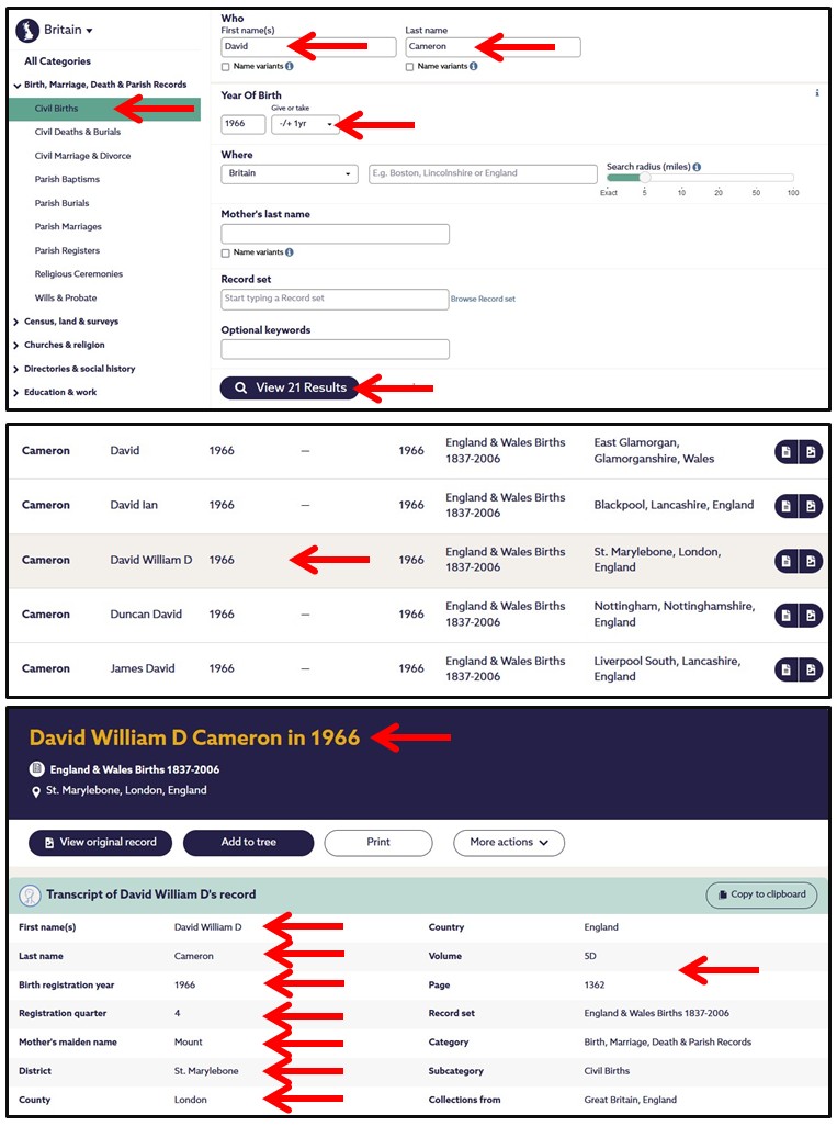 Using David Cameron, a previous UK Prime Minister as an example, first get a few basic details for the subject. On Companies House he is listed as David William Donald Cameron, with a date of birth in October 1966. Then, first of all searching for the record of his birth, will provide details of their Mothers Maiden / Last Name and the exact area they were born in. Remember that when you have a baby you have several weeks to register the birth, so babies born towards the end of a year may not actually have their birth registered until the start of the following year.
