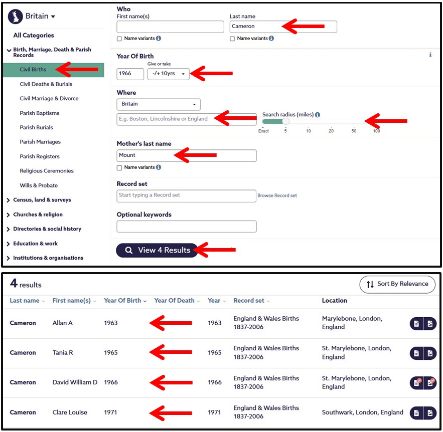 Next, now that David Cameron's Mothers Maiden / Last Name is known, a search can be made for any possible Siblings. If the Surname & Mothers Maiden / Last Name you are researching are fairly common you may want to change the date range to 10years or even 5years either side of your subject's year of birth, and adjust the location to closer to where your subject was born.
