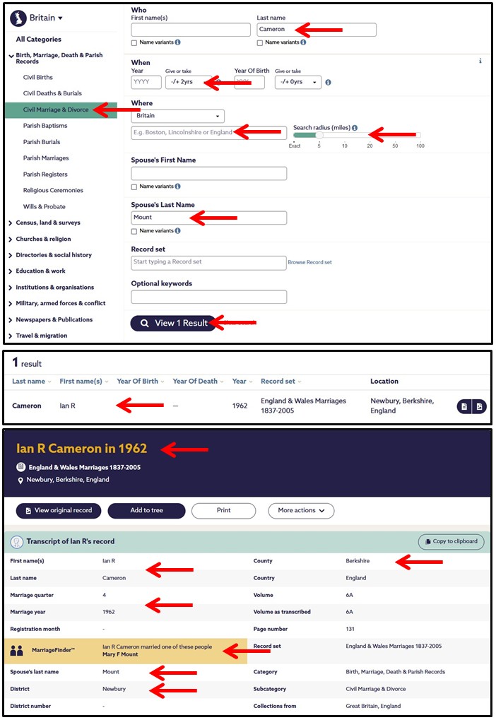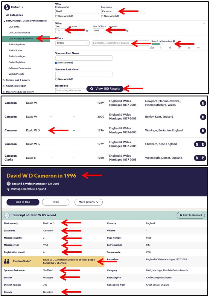 Then you could search for any Marriage of David Cameron. Again if the names you are searching are fairly common you may want to adjust the date range & / or location of the Marriage.
