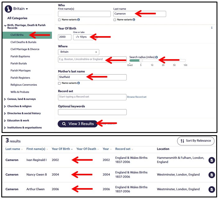 Then you could search for the Marriage of David Cameron's Parents, using the Surname & Mothers Maiden / Last Name. Again if the names you are searching are fairly common you may want to adjust the date range & / or location of the Marriage. Obviously, people don't have to get Married but always use your own life experiences when you conduct your research.